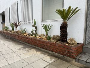 アガベやソテツを植えて、夏の暑さにも負けない力強い花壇ができました。