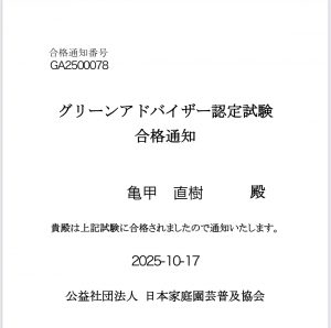実は9月の下旬にグリーンアドバイザーという資格を取得しておりまして。